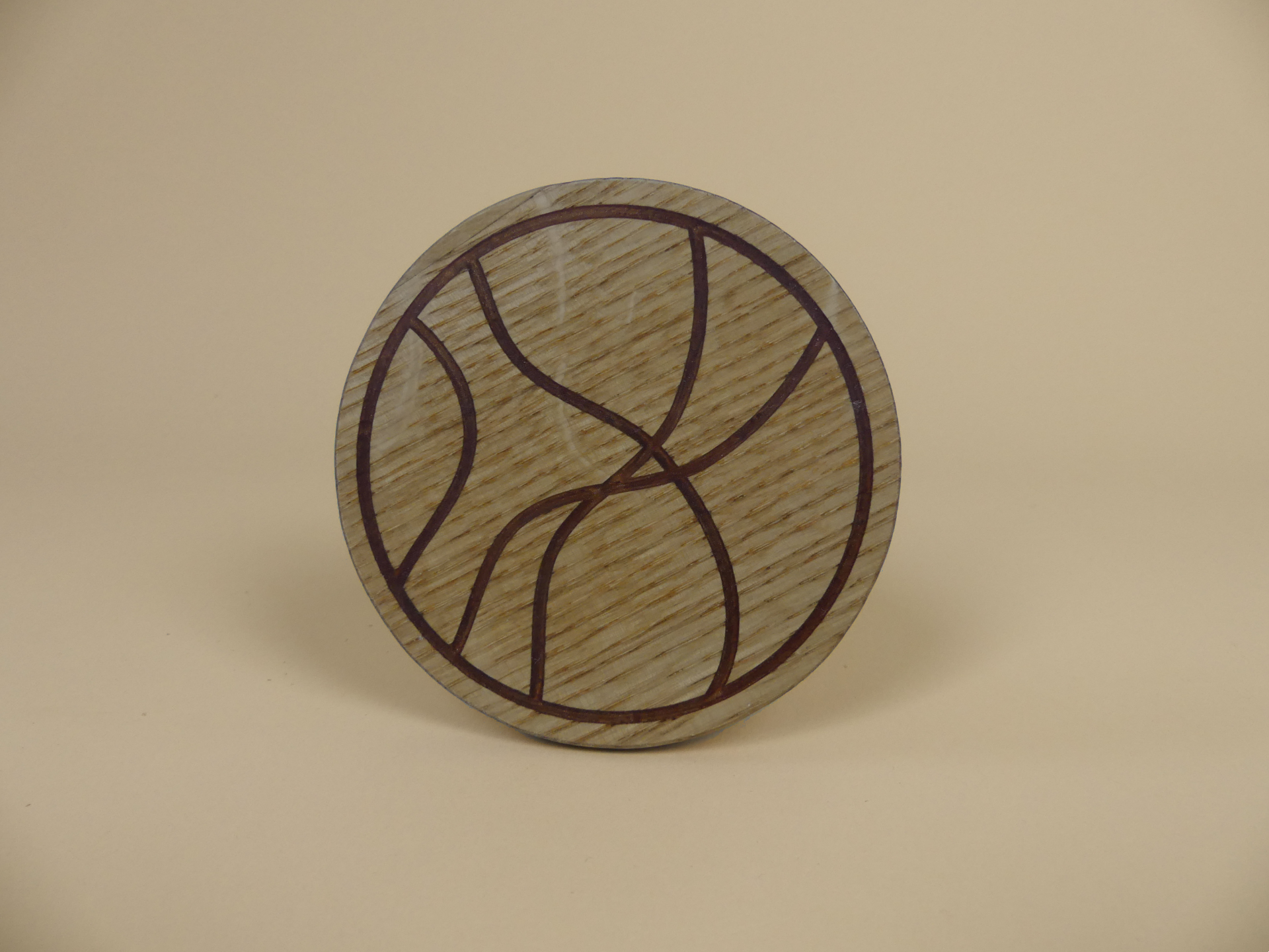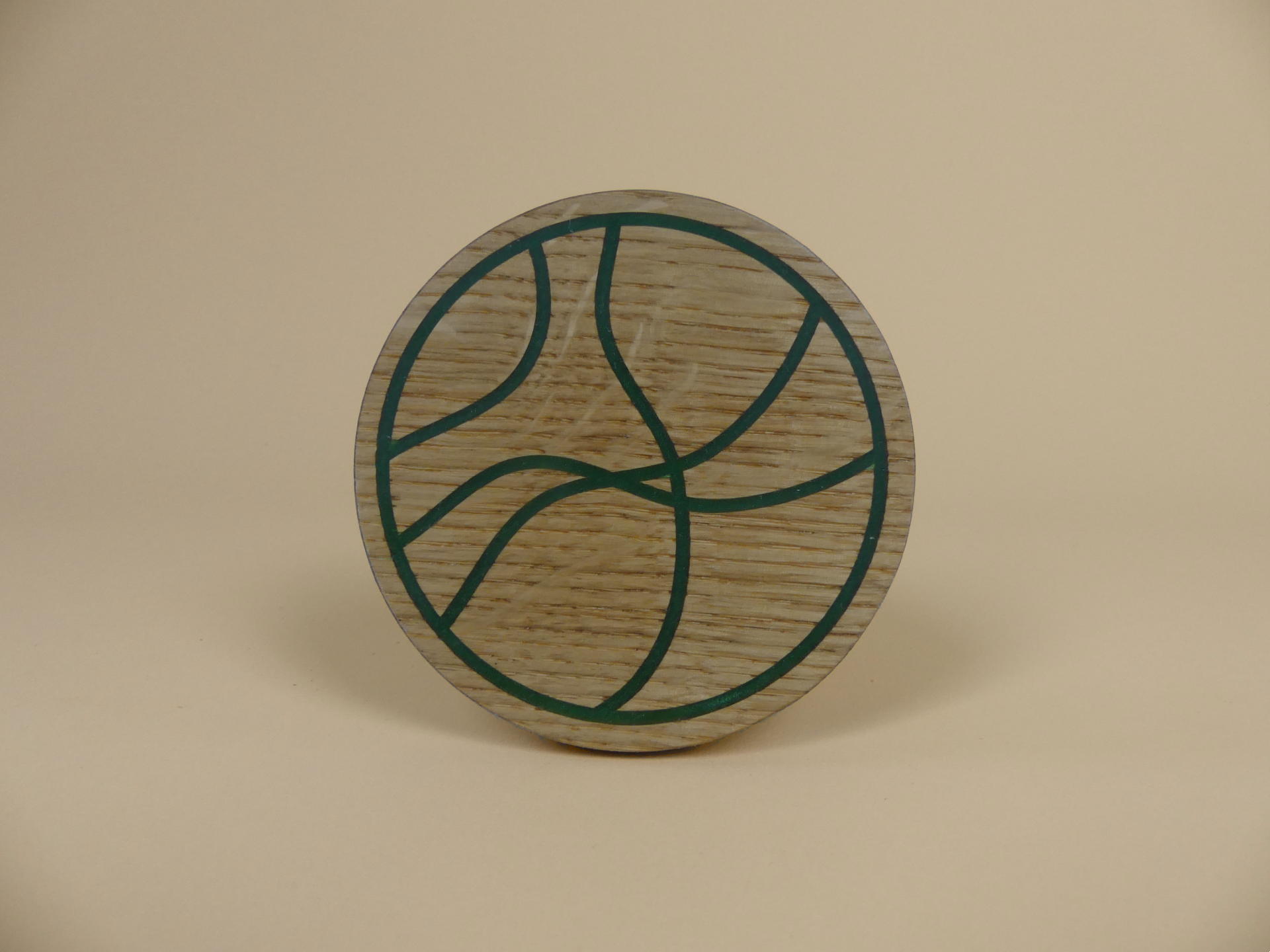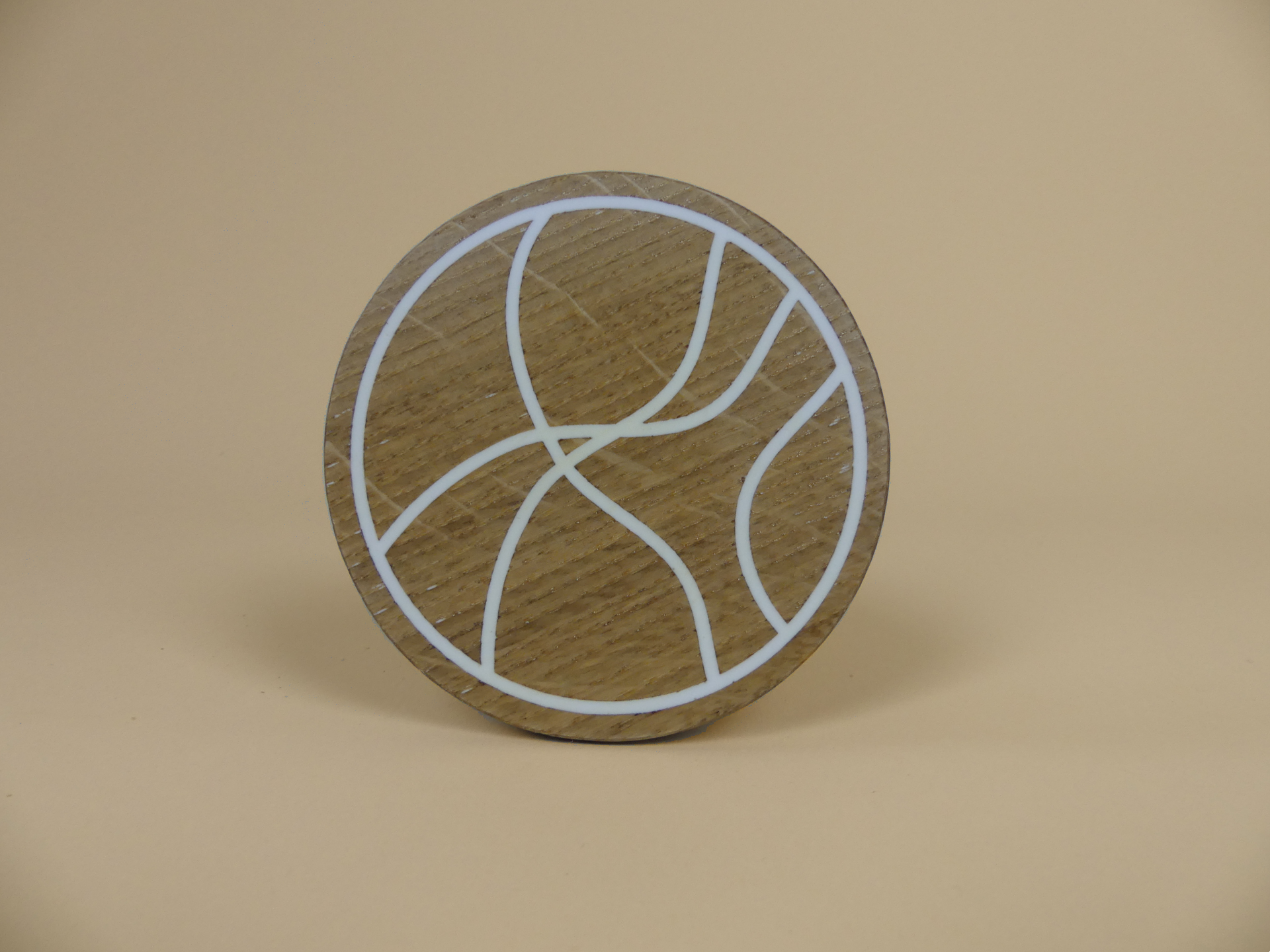Onderzetter gemaakt uit eik, opgevuld in diverse kleuren.